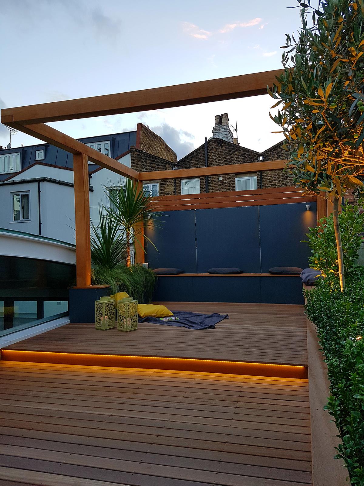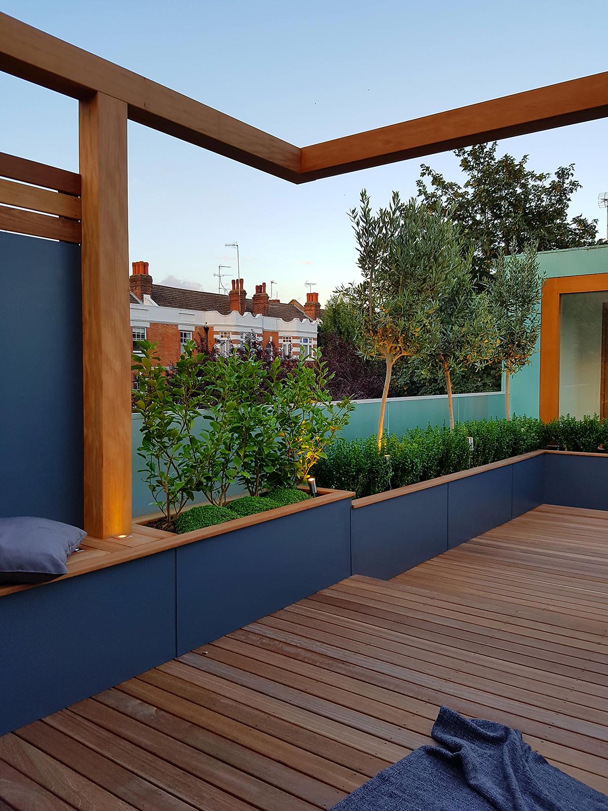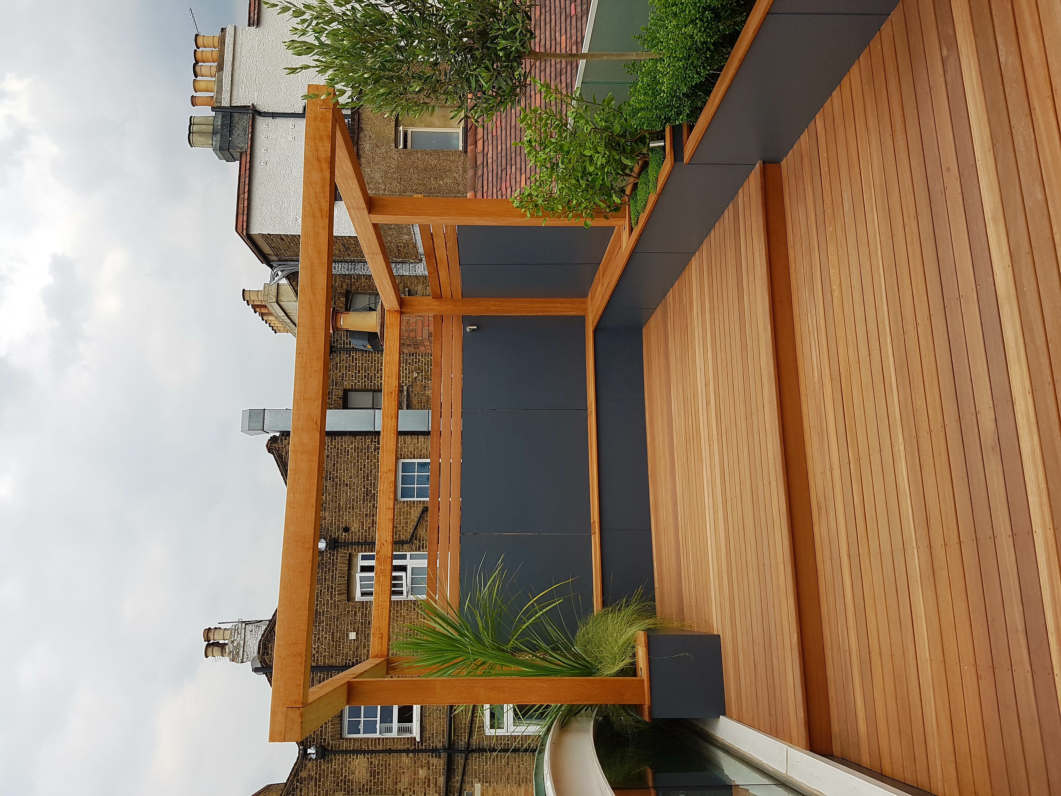 This Architect designed property had an existing roof terrace and a lower balcony level with access from the living room. We were commissioned to design usable decked area to both spaces. The main roof space had access via a spiral staircase which opened out onto the roof. Here we designed hardwood deck areas and a cantilevered hardwood pergola over the built in seating area. Medite Tricoya Extreme (MTX) A modified timber panel product was used to create built in planters and screening panels to the rear of the pergola. Olive trees, cordylines, box and grasses were used for a simple but effective planting combination.