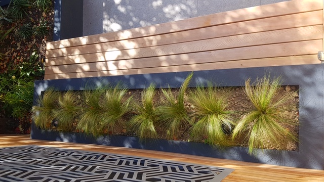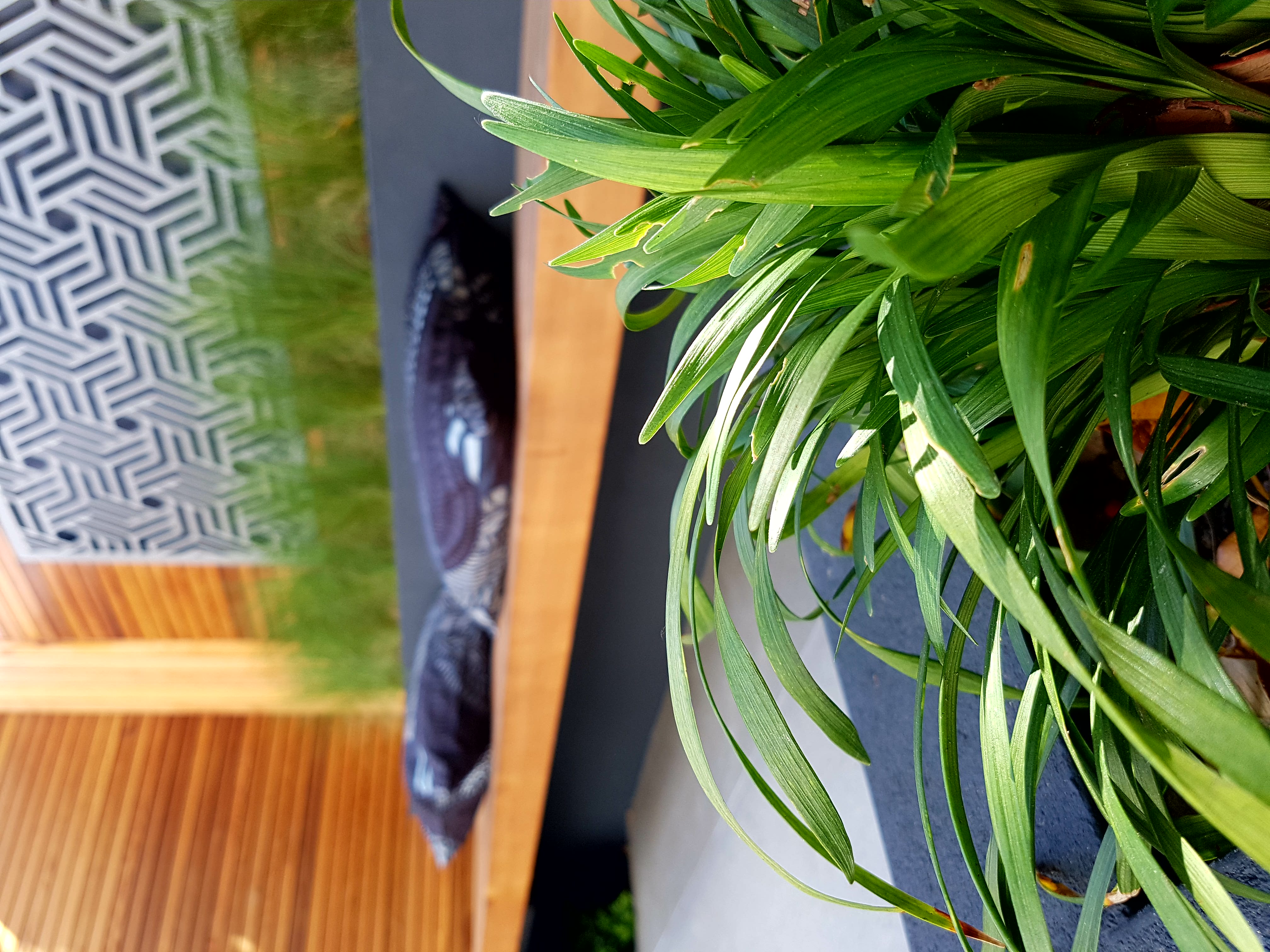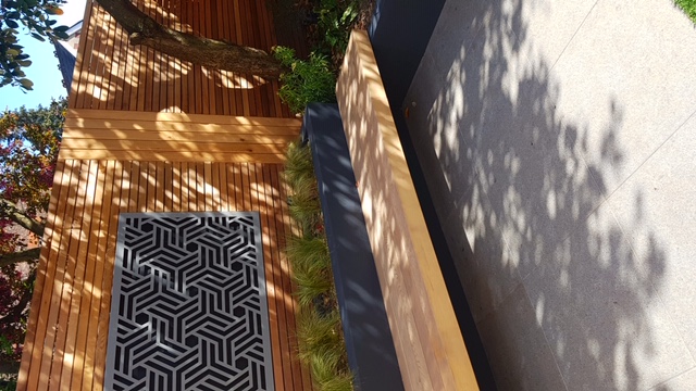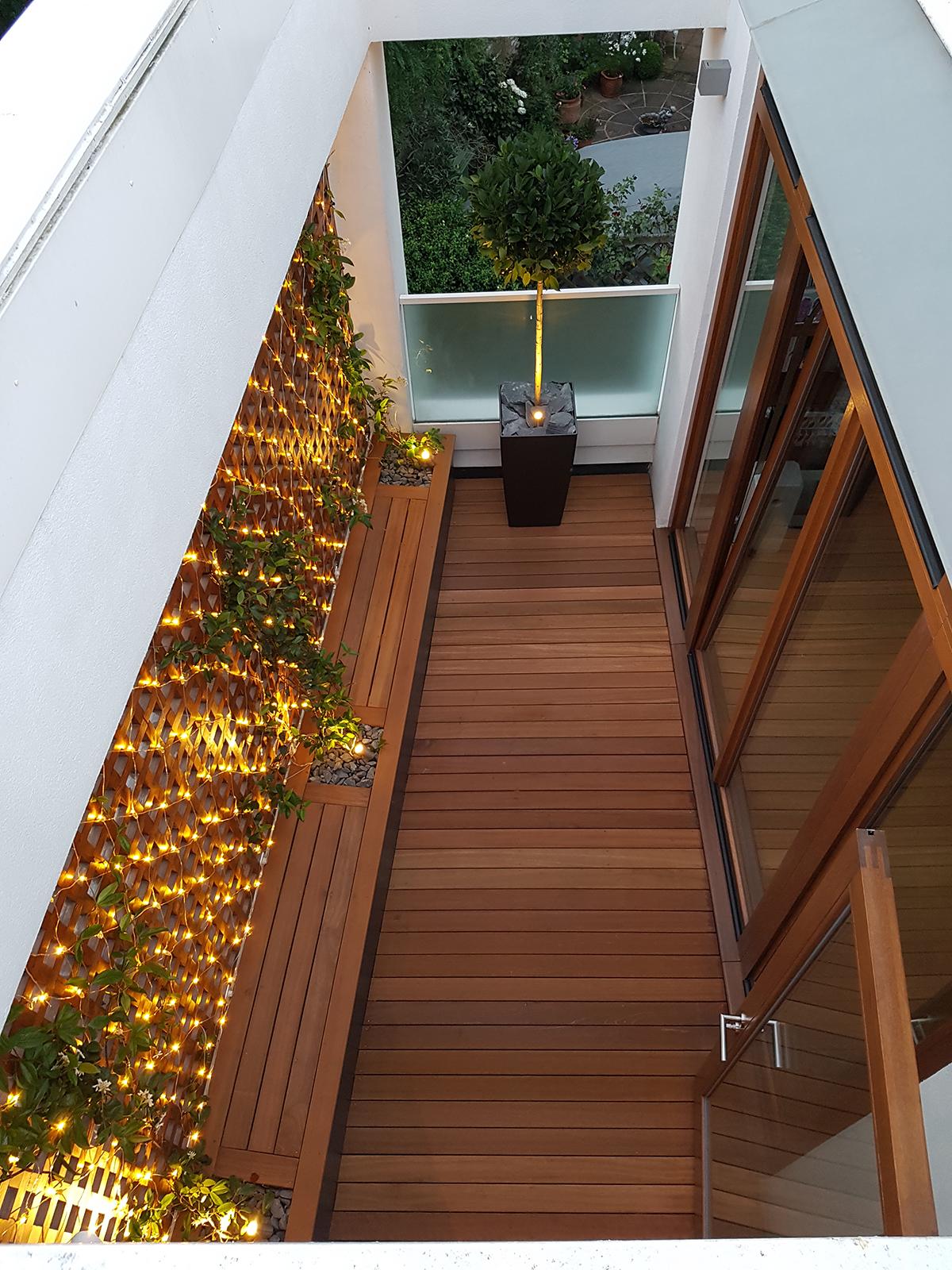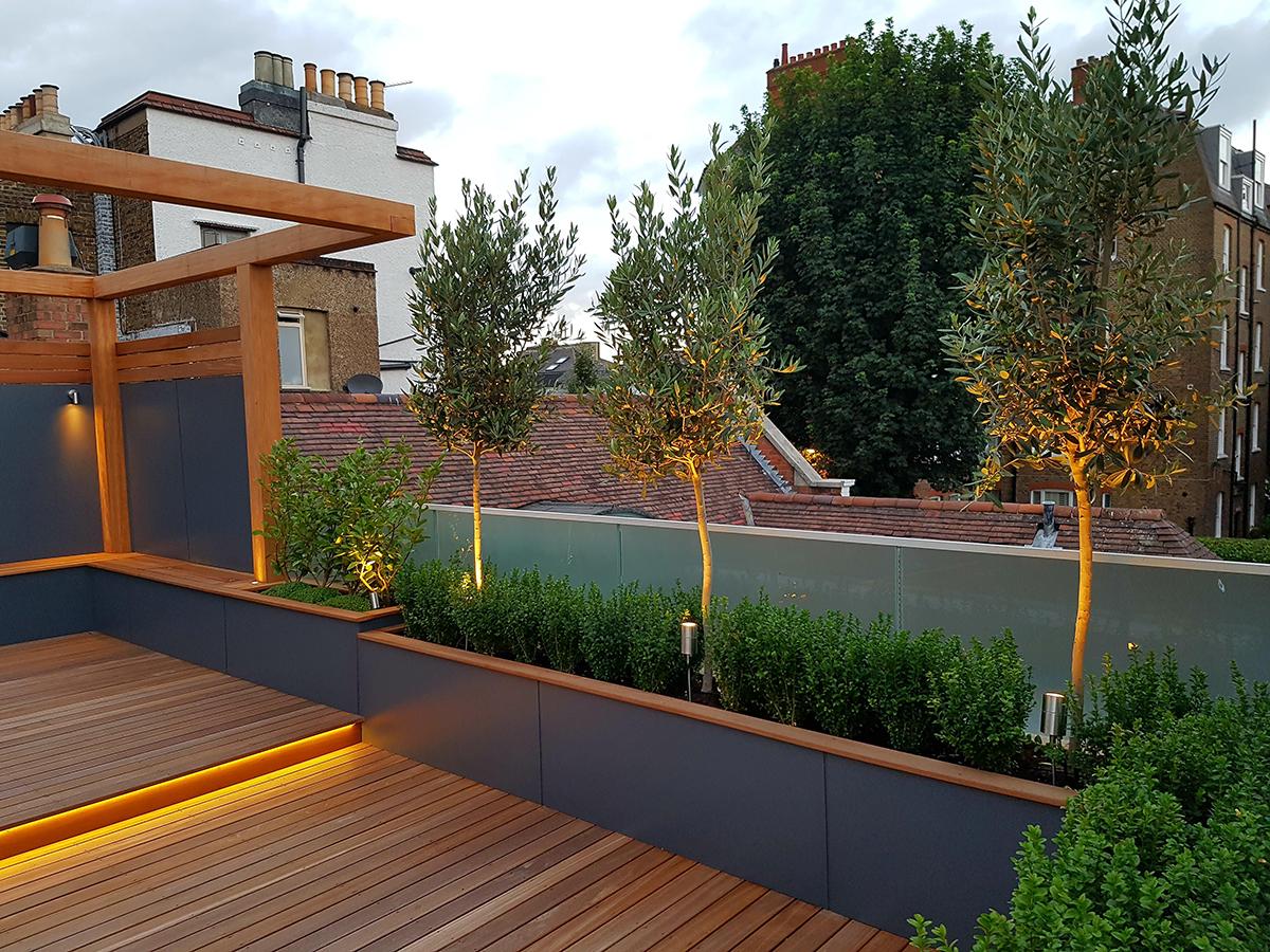 This Architect designed property had an existing roof terrace and a lower balcony level with access from the living room. We were commissioned to design usable decked area to both spaces. The main roof space had access via a spiral staircase which opened out onto the roof. Here we designed hardwood deck areas and a cantilevered hardwood pergola over the built in seating area. Medite Tricoya Extreme (MTX) A modified timber panel product was used to create built in planters and screening panels to the rear of the pergola. Olive trees, cordylines, box and grasses were used for a simple but effective planting combination.