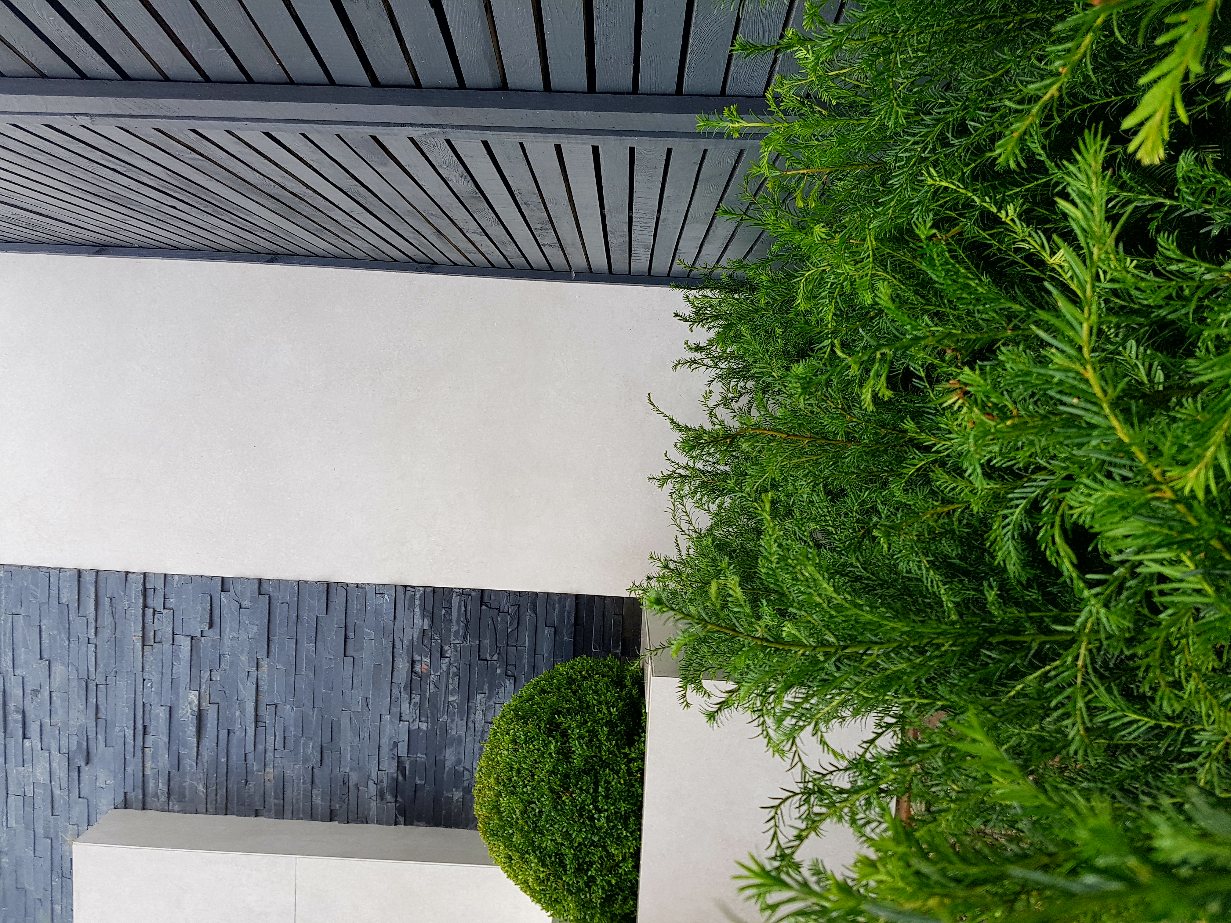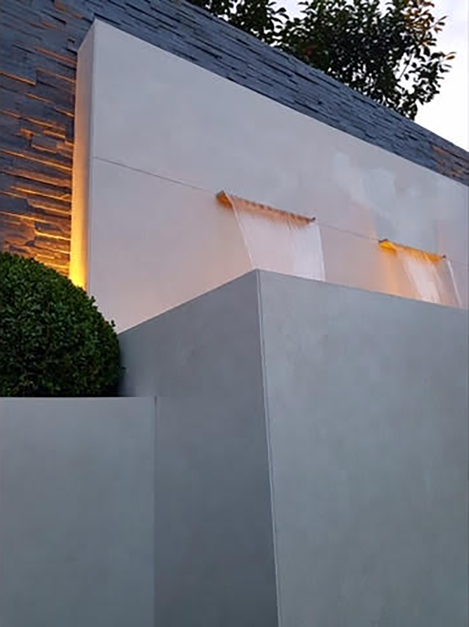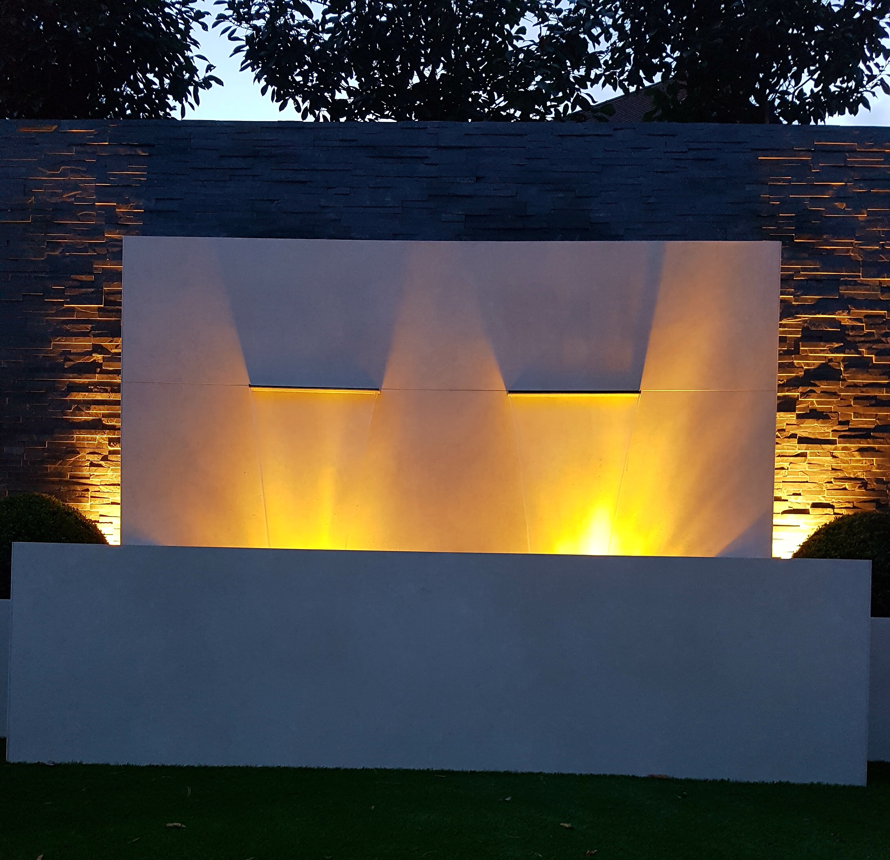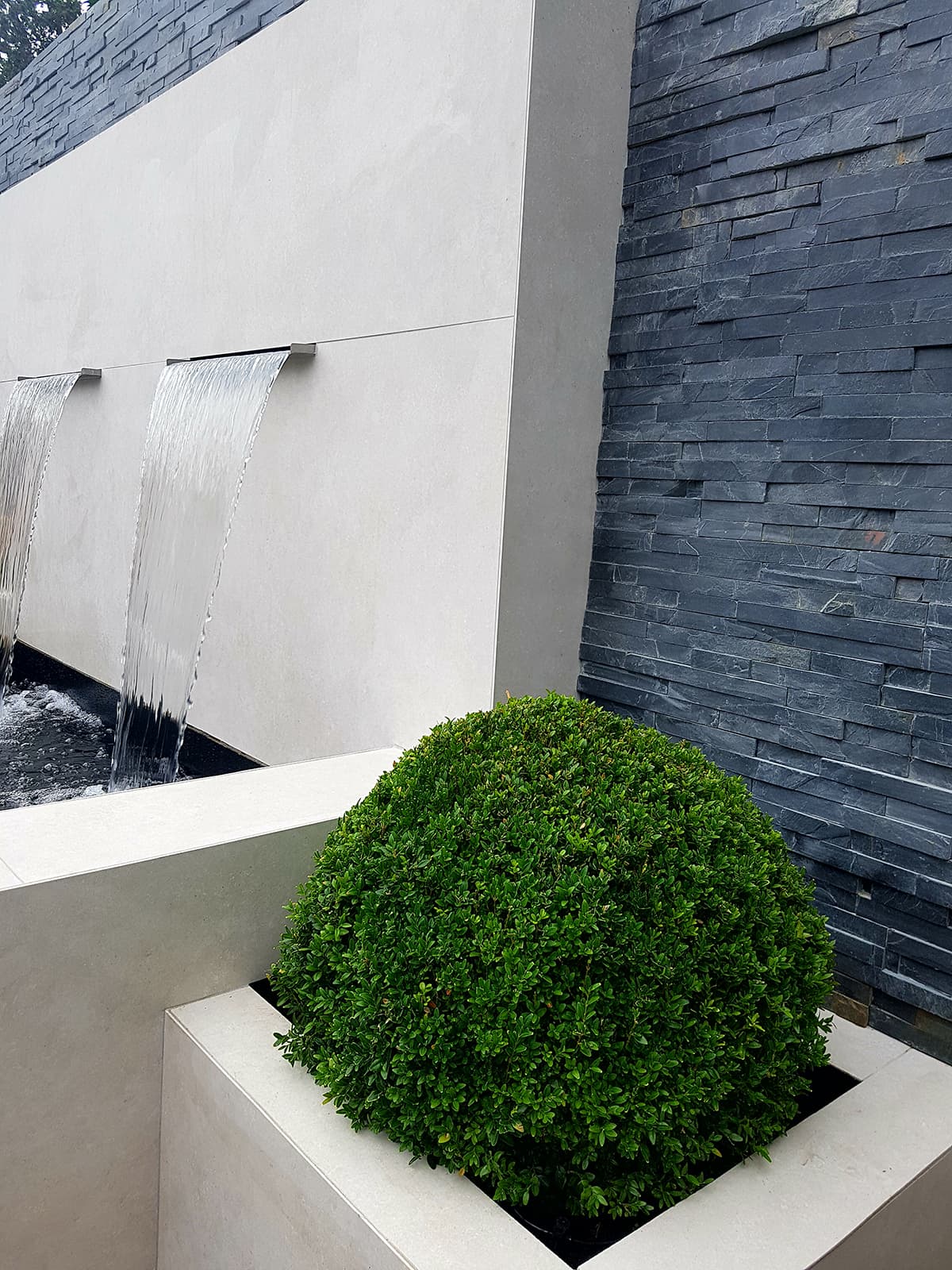 The main feature of this garden design was a large water feature. The face was clad in porcelain sheet set off against rugged slate side panels, the two materials in complete contrast with each other. Internal lighting provided dramatic viewing at night from the double outlet supply. Pleached trees underplanted with a Yew hedge and simple box balls provide simplistic planting.