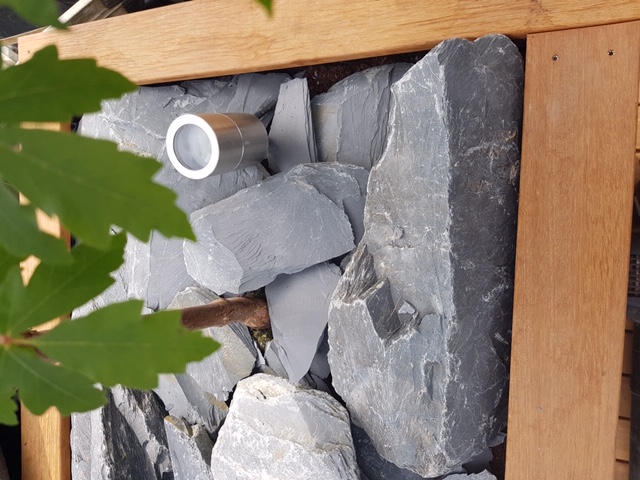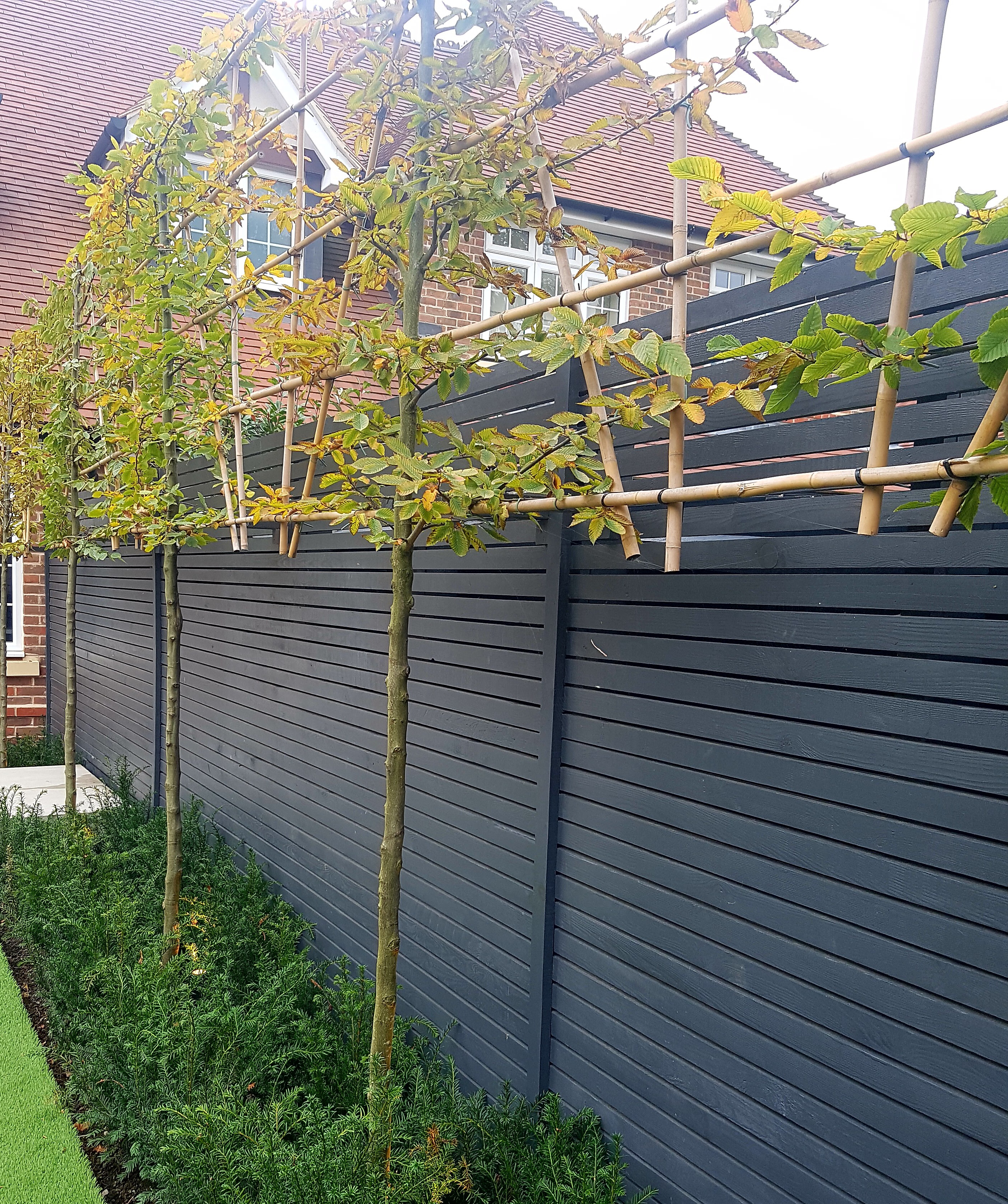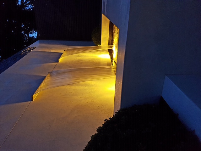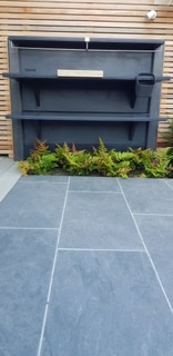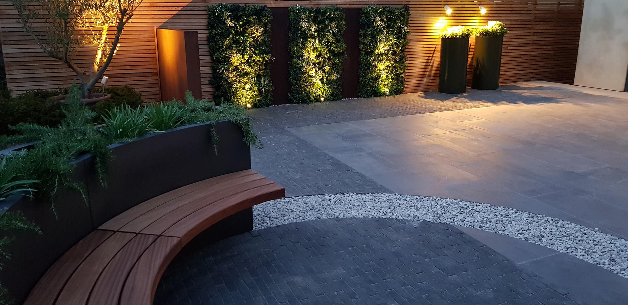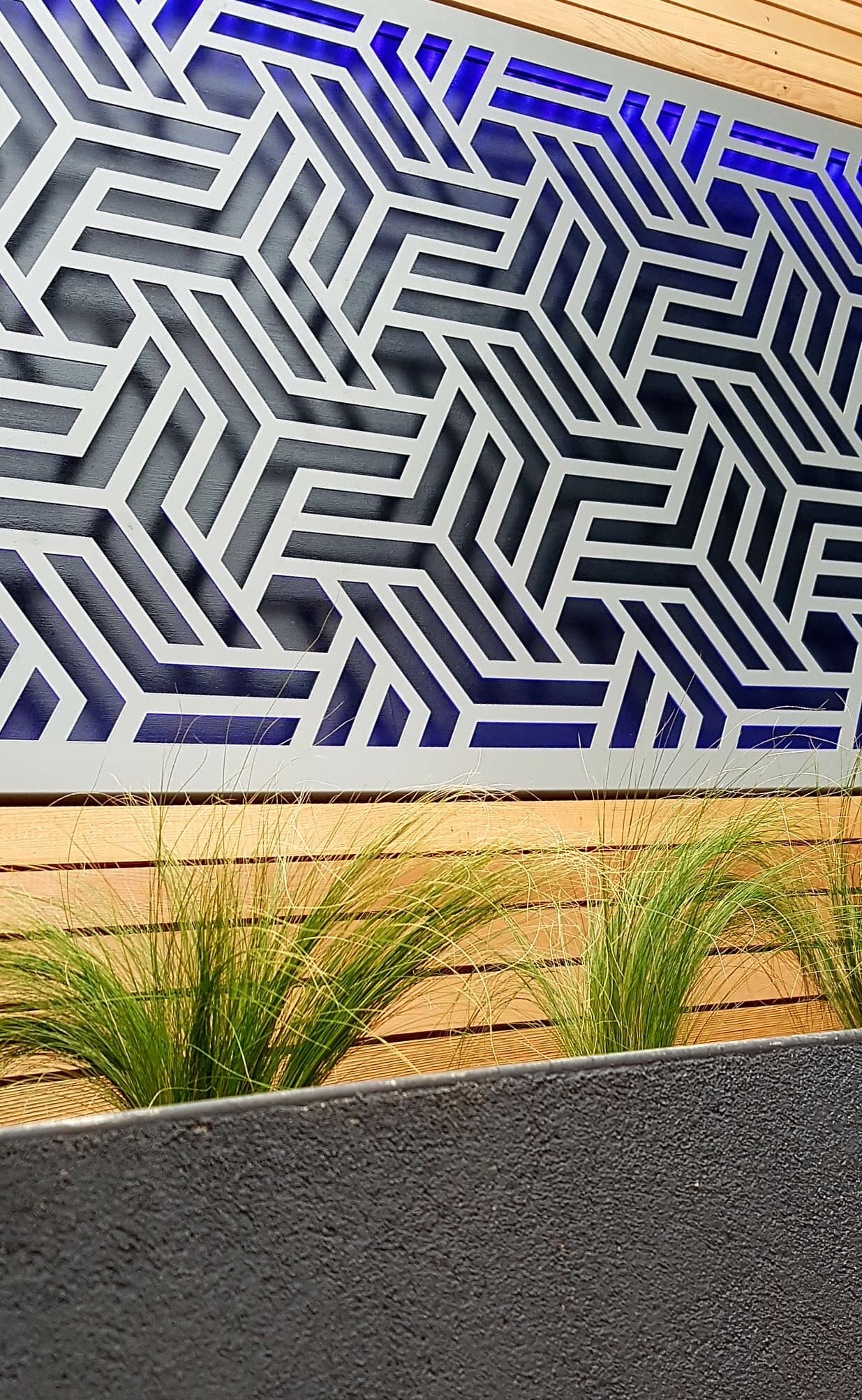 The main feature of this garden design was a large water feature. The face was clad in porcelain sheet set off against rugged slate side panels, the two materials in complete contrast with each other. Internal lighting provided dramatic viewing at night from the double outlet supply. Pleached trees underplanted with a Yew hedge and simple box balls provide simplistic planting.