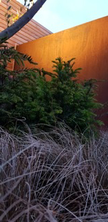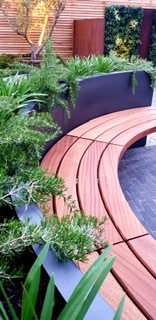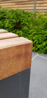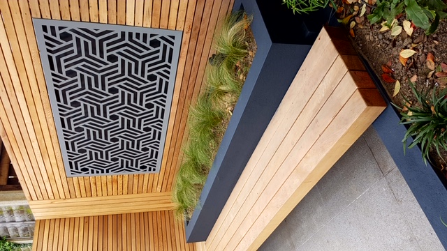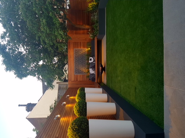 The design for this garden includes a circular seating area with built in planters formed from GRP and Sapele hardwood, a pleasing blend of grey porcelain and clay pavers, Corten steel panels and a steel wall set into the cedar screening with artificial green walls. Pleached Hornbeams with an underplanting of Yew keep it simple with additional grasses, ferns and container planting. A Wwoo concrete kitchen adds sleek style for outdoor Cooking (see our blog page for more details on this) Remote control LED lighting make the garden useable well after dark.