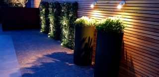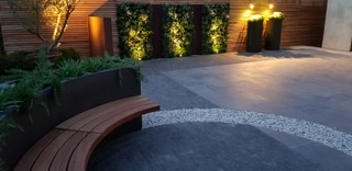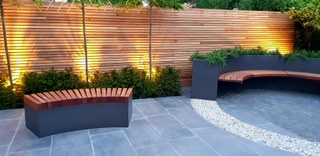The garden of this Victorian mid terraced house was designed for all the family to enjoy. It had an original granite paved area to the rear of the house which was to be kept and blended in with the new design. The boundary fences were designed with Western Red Cedar cladding throughout. Along the back fence we designed wider vertical timbers which matched the size of the floating benches. Blue/grey granite paving was installed beneath making a connection to the original stone. Set within the back fence is a bespoke metal wall panel with inset LED lighting which creates a great focal point from inside the property. Four large cylindrical containers sit on a purpose built plinth, each with its own downlighter. Additional planting includes grasses, ferns, euphorias and mahonia.