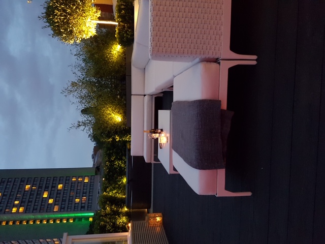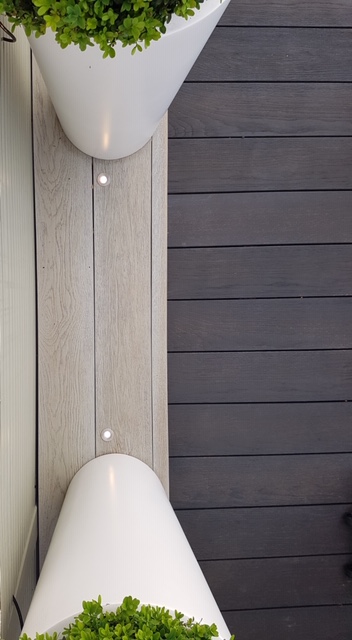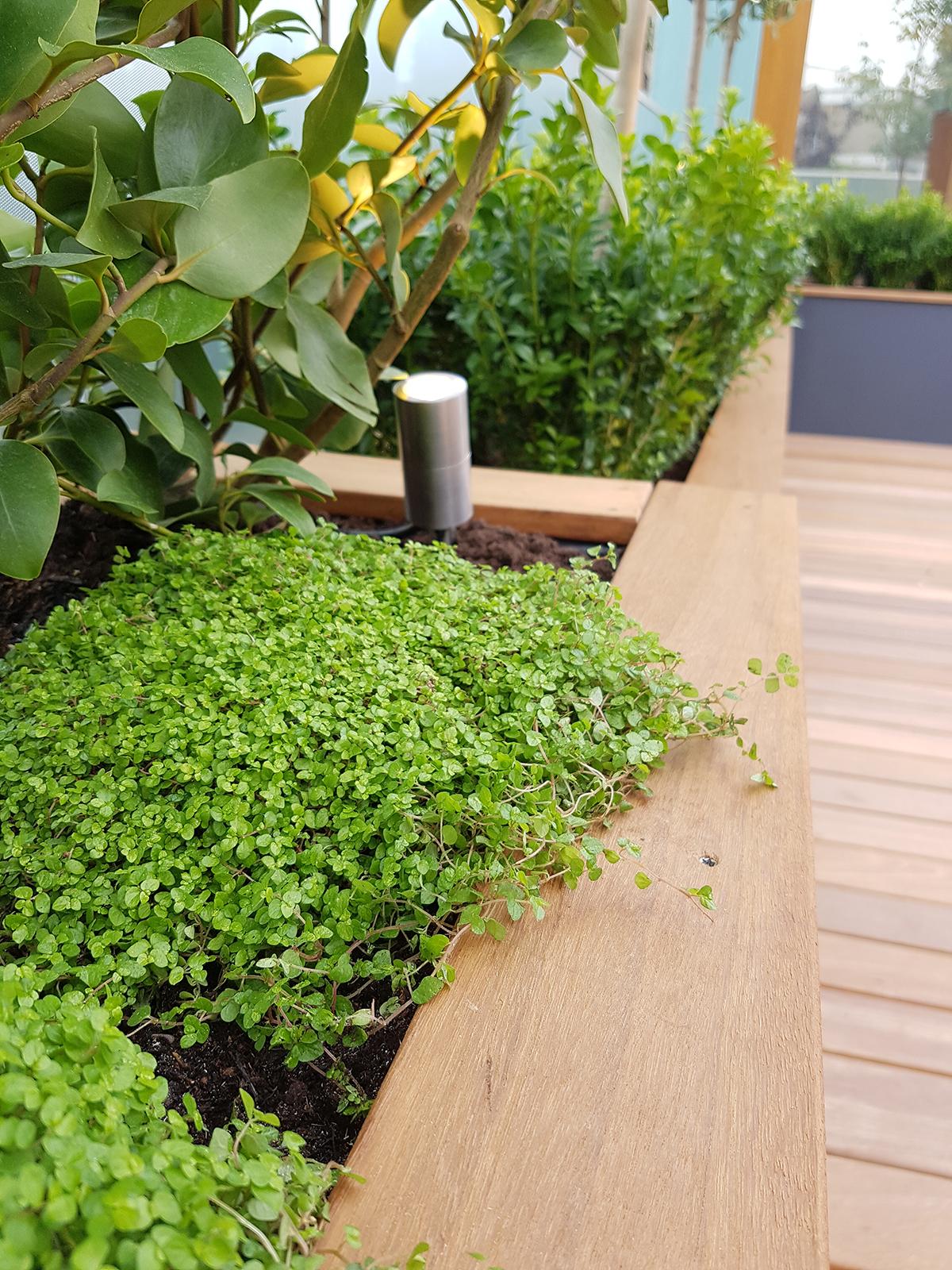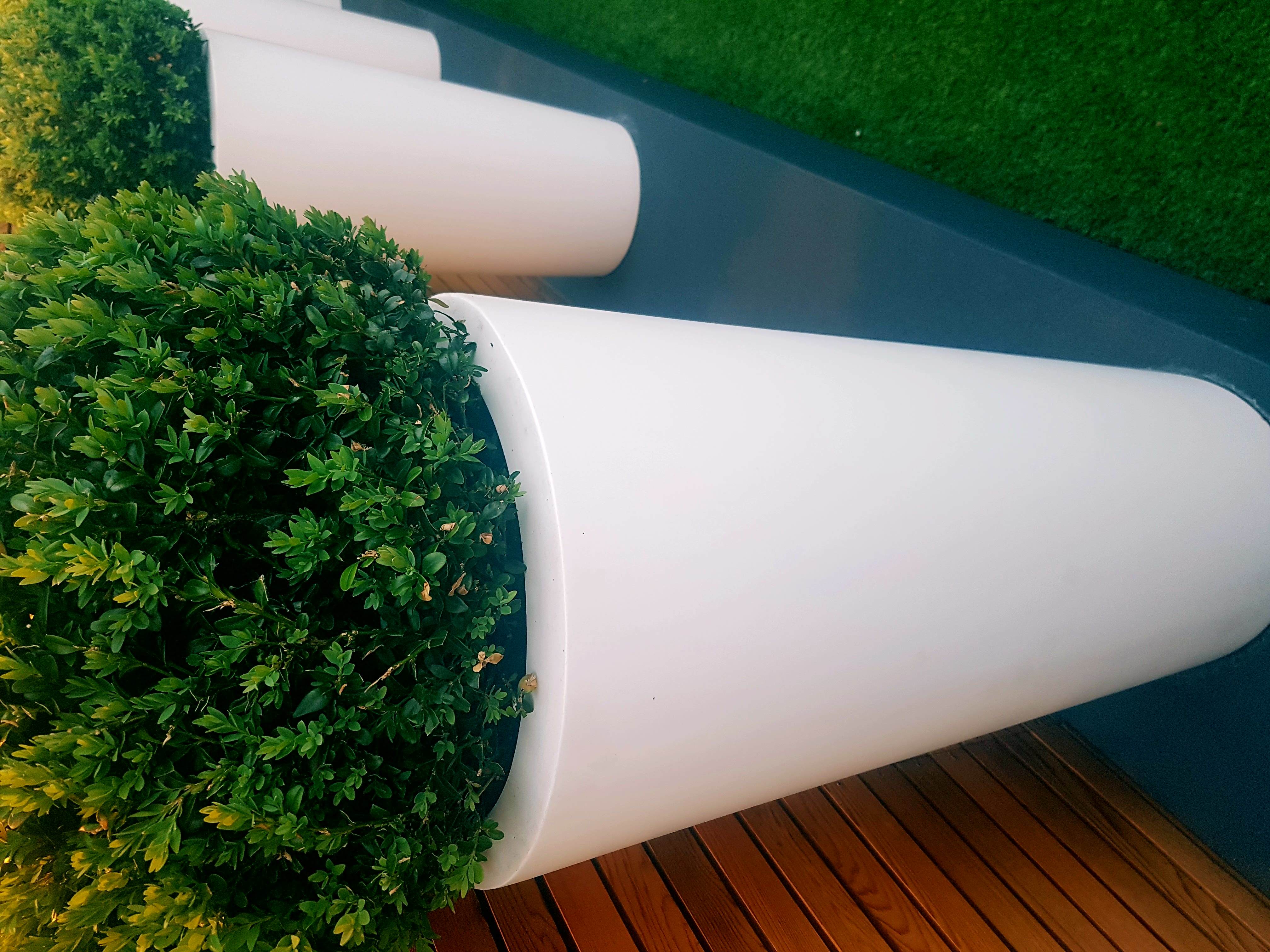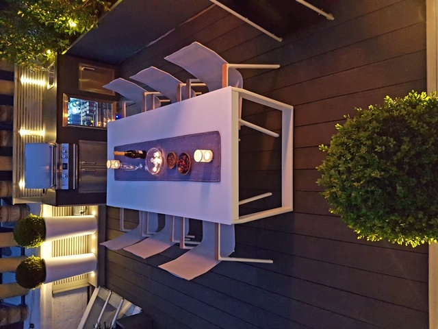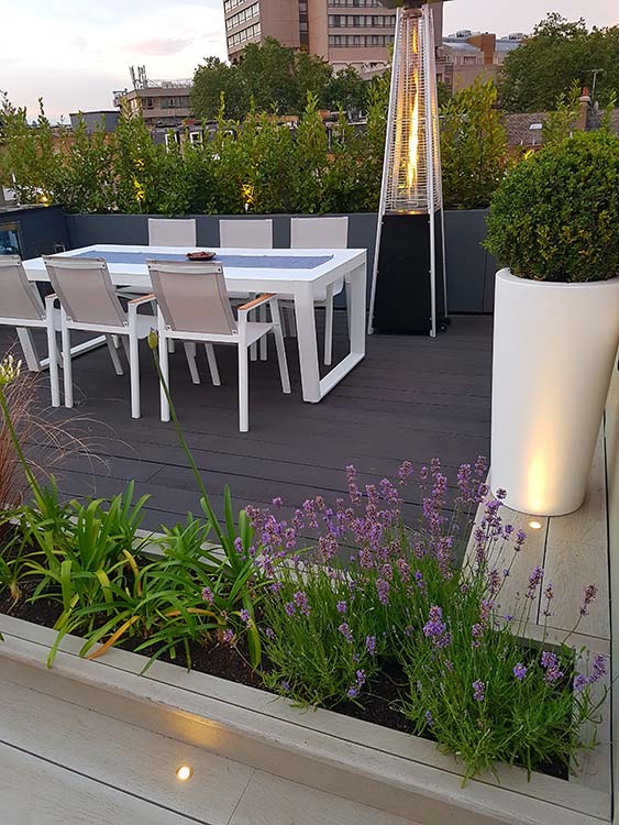 GRP planters we used throughout to provide privacy and consistency to the scheme and planted with Greselinia littoralis, a tough, quick growing evergreen shrub from New Zealand providing a green barrier and backdrop to the terraces. Millboard decking in two colours was chosen for the flooring, a perfect choice for roof terraces with its great looks and easy care nature. We designed a bespoke Cooking zone with built in BBQ and rotisserie, granite counter top with sink, outdoor fridge and stainless steel storage cupboards. Artificial green wall panels were fitted to the lounge side of the chimneys with a small central water feature.