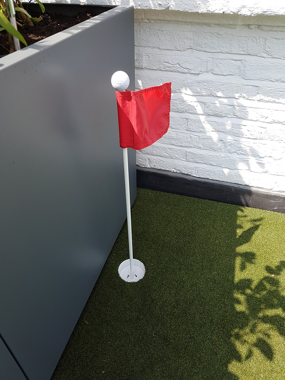 The roof terrace itself is actually two roofs divided by a row of chimneys with an opening between to form two separate areas. We further divided this space to give a relaxation area with jacuzzi, sofas and low coffee table to one side and a kitchen/dining area with lawn area and play zone for the children to the other side. This also included a golf putting green within the artificial lawn.